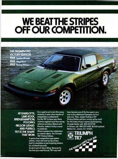 Triumph_TR7_Ad_1976 Published July 29, 2011 at 412 × 556 in Rad Ads: Blondes Selling Booze (’76) The Triumph TR7 in Forest Green. I’ll take two!