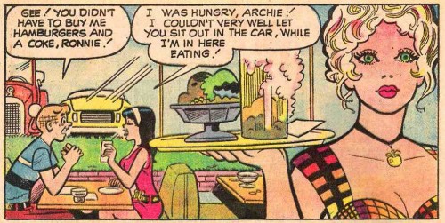 You may want to hop over and check out this amazing gallery focused on Archie Comics artist Dan DeCarlo (creator of Josie and the Pussycats) and his fascinating habit of drawing a large female face prominently in the foreground of various comic book frames. Early “photobombing” at its finest.