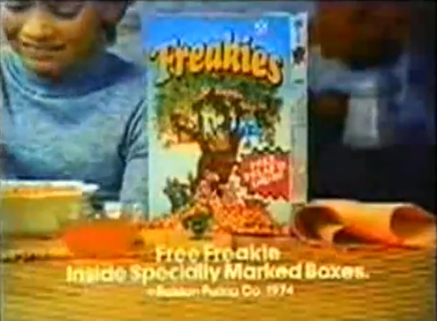 Ralston_Freakies_Cereal_TV_1974 Published July 20, 2012 at 624 × 458 in 70s Spots: Freakies cereal Freakies cereal spot, 1974. ‘You too can have crunchy, Freakie cereal as part of your good breakfast.’