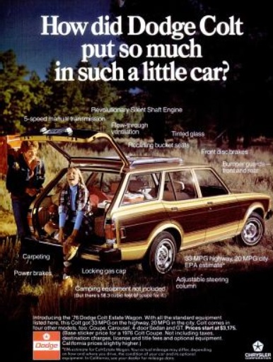 Dodge_Colt_New_York_Jan_26_1976 Published March 18, 2014 at 386 × 512 in Daily 70s Ad: Dodge Colt ‘Camping’ (1976) Dodge Colt ‘Camping.’ (‘New York’ magazine, Jan. 26, 1976)
