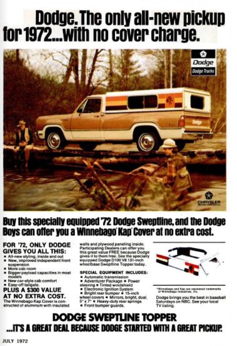 Dodge_Sweptline_Pickup_Winnebago_Kap_Topper_Popular_Mechanics_July_1972 Published July 22, 2014 at 472 × 689 in Daily 70s Ad: Dodge Sweptline Pickup (1972) Dodge Sweptline Pickup. (‘Popular Mechanics’ magazine, July, 1972)