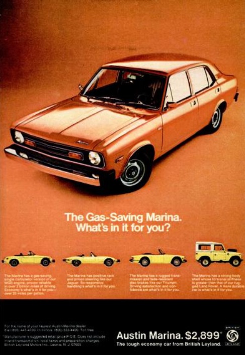 Austin_Marina_British_Leyland_August_1974_Popular_Mechanics Published August 18, 2014 at 487 × 705 in Daily 70s Ad: British Leyland’s Austin Marina (1974) British Leyland’s Austin Marina. (‘Popular Mechanics’ magazine, August, 1974)