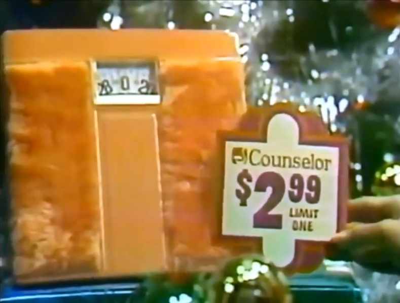 This year, why not pick up a few Christmas gifts at the tire store? In this Firestone commercial from November 1972 holiday present ideas include a fuzzy bathroom scale, a Christmas lights timer, and a Philco AM-FM “Swing-A-Long”radio.