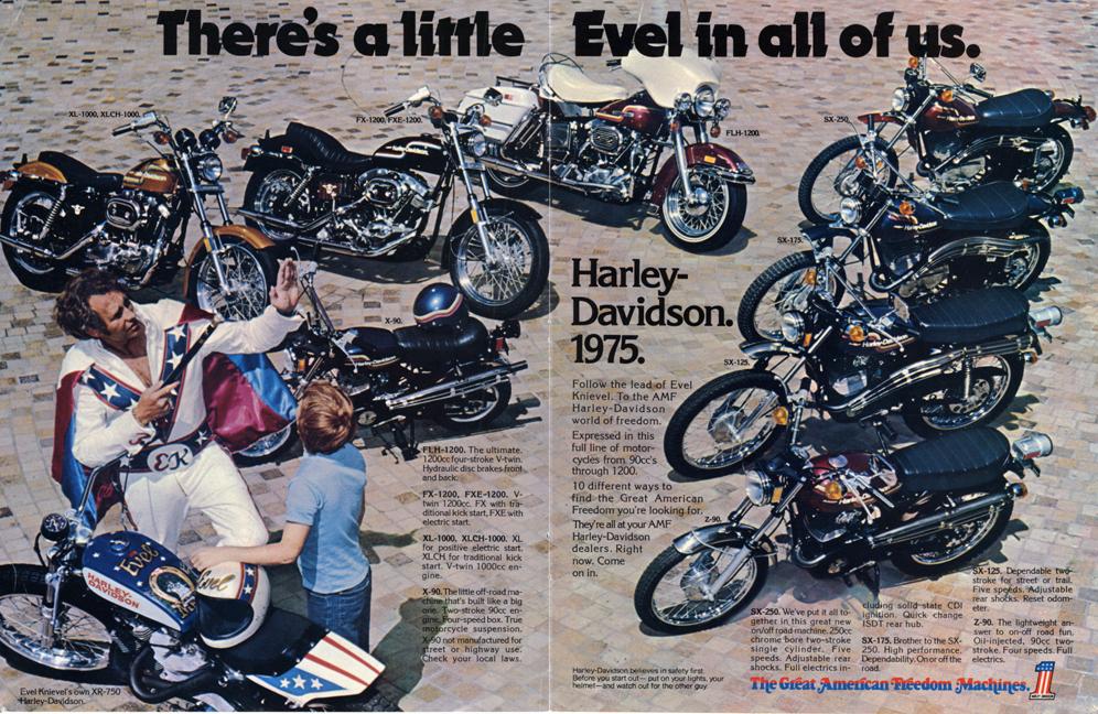 Here’s a totally radical magazine ad for you from 1975. Evel Knievel for Harley-Davidson – featuring “Knievel’s own XR-750” and other nifty AMF Harleys such as the FXE-1200 and the Z-90.