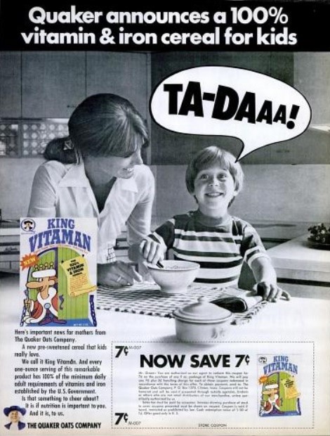 Save an incredible 7 cents! Daily 70s Ad #282: Quaker’s King Vitaman Cereal originally appeared in the October 16, 1970 issue of LIFE magazine.