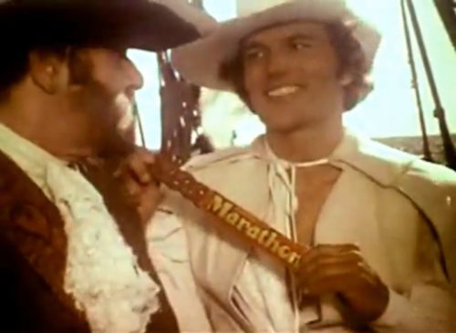 A pair of Marathon candy bar commercials from the Mars company today. First, Patrick Wayne appears as Marathon John in a pirate-themed spot from 1974. Wayne did a series of these commercials for Marathon.